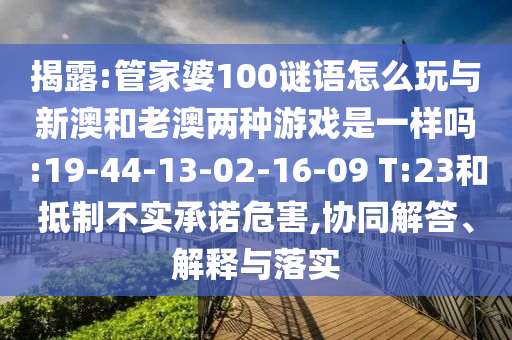 關于揭露“管家婆100謎語”的玩法以及新澳和老澳兩種游戲是否一樣,還有關于特定數(shù)字組合(如:19-44-13-02-16-09 T:23)的協(xié)同解答、解釋與落實,以及抵制不實承諾的危害等問題,以下是對這些問題的全面釋義和解釋。